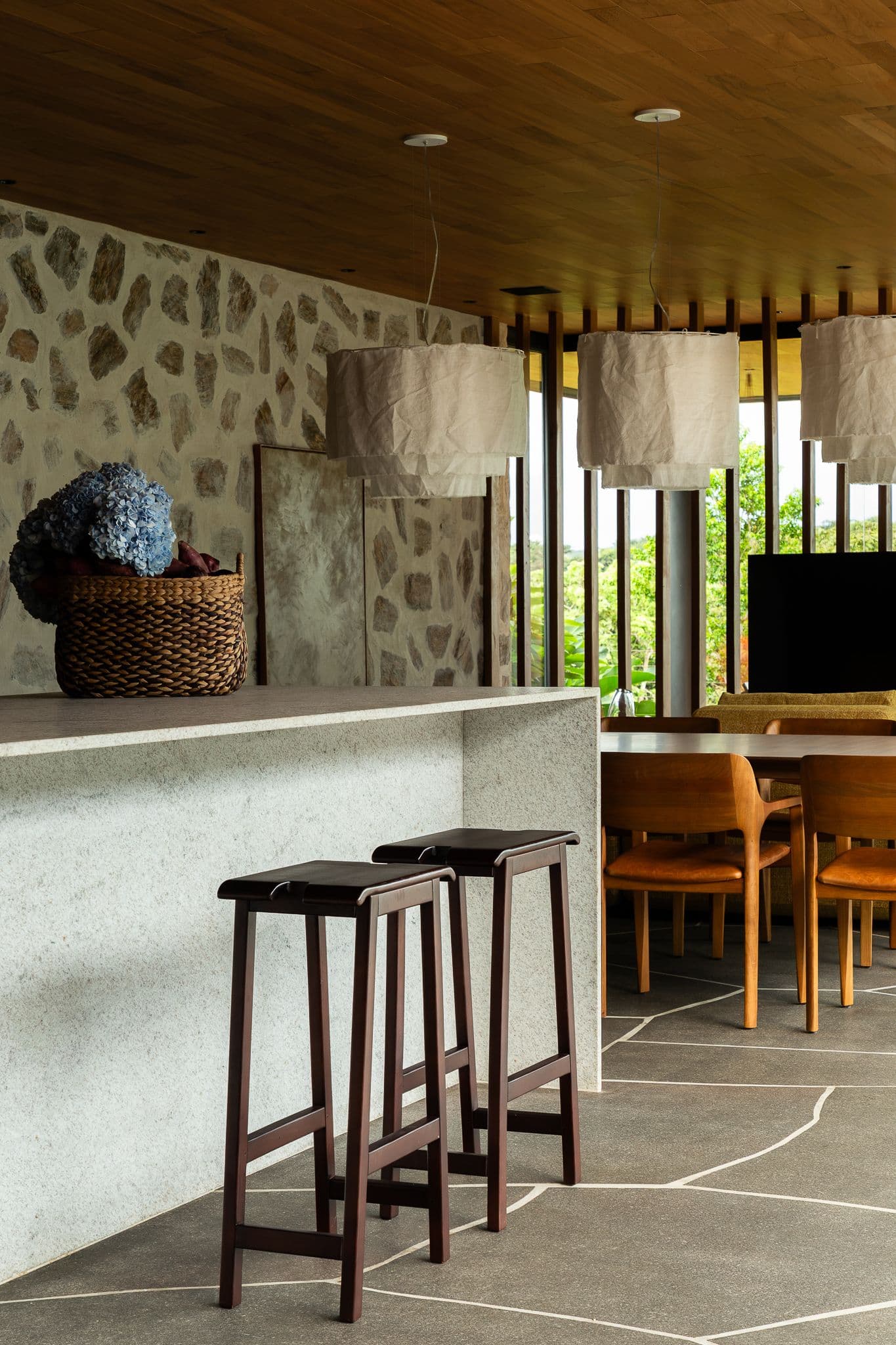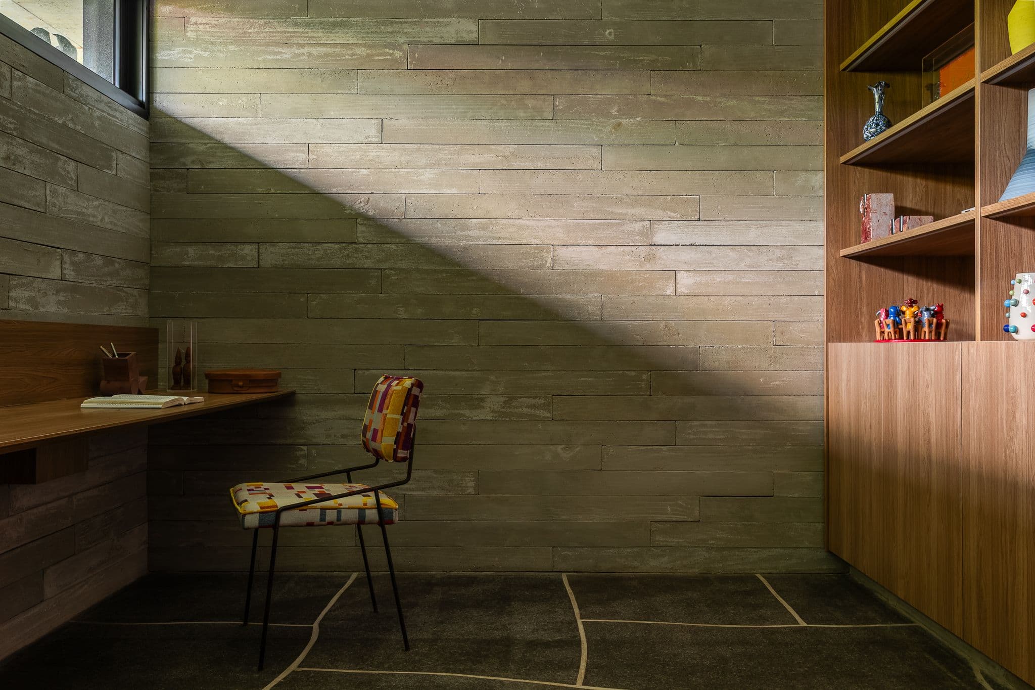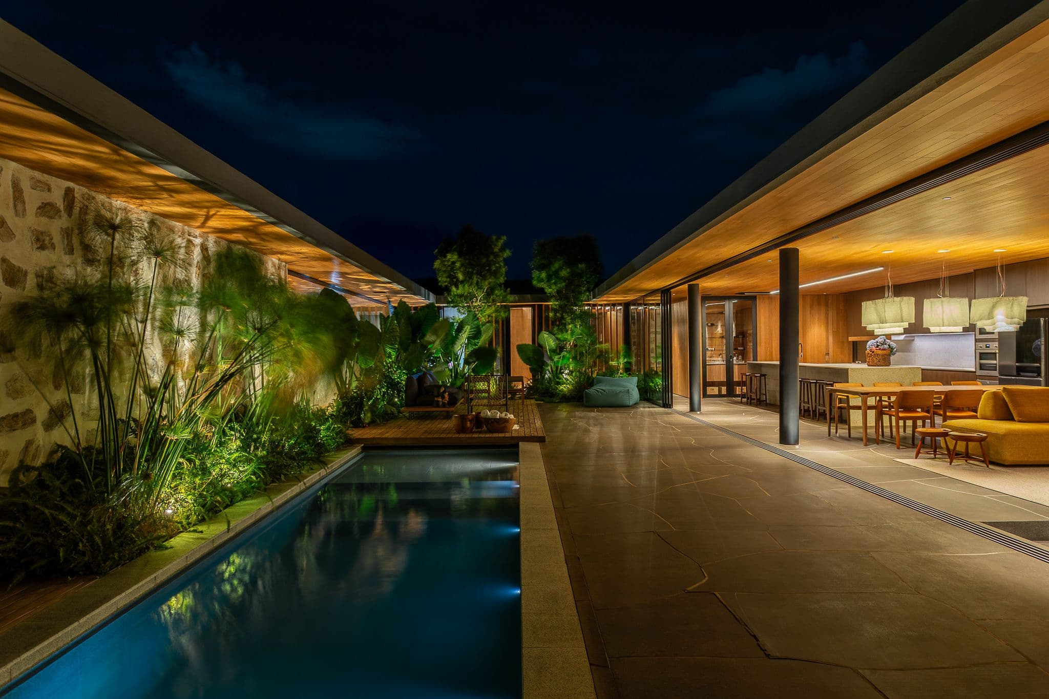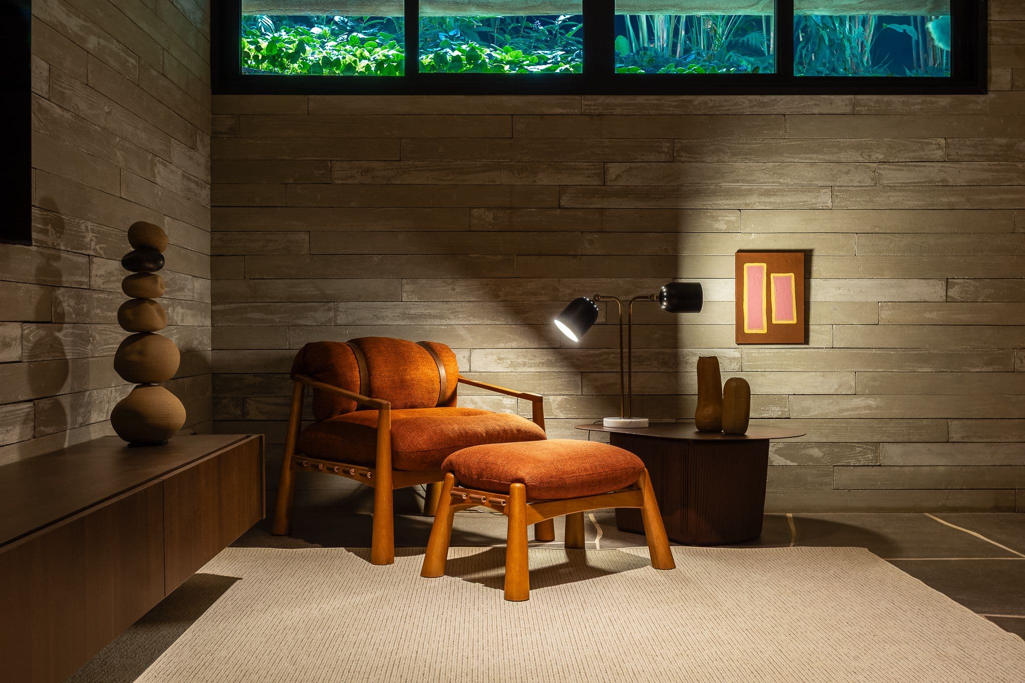 Os materiais foram escolhidos pela sua autenticidade: concreto aparente, madeira cumaru e pedra natural compõem uma paleta que envelhece com dignidade, criando texturas que mudam com a luz e as estações.