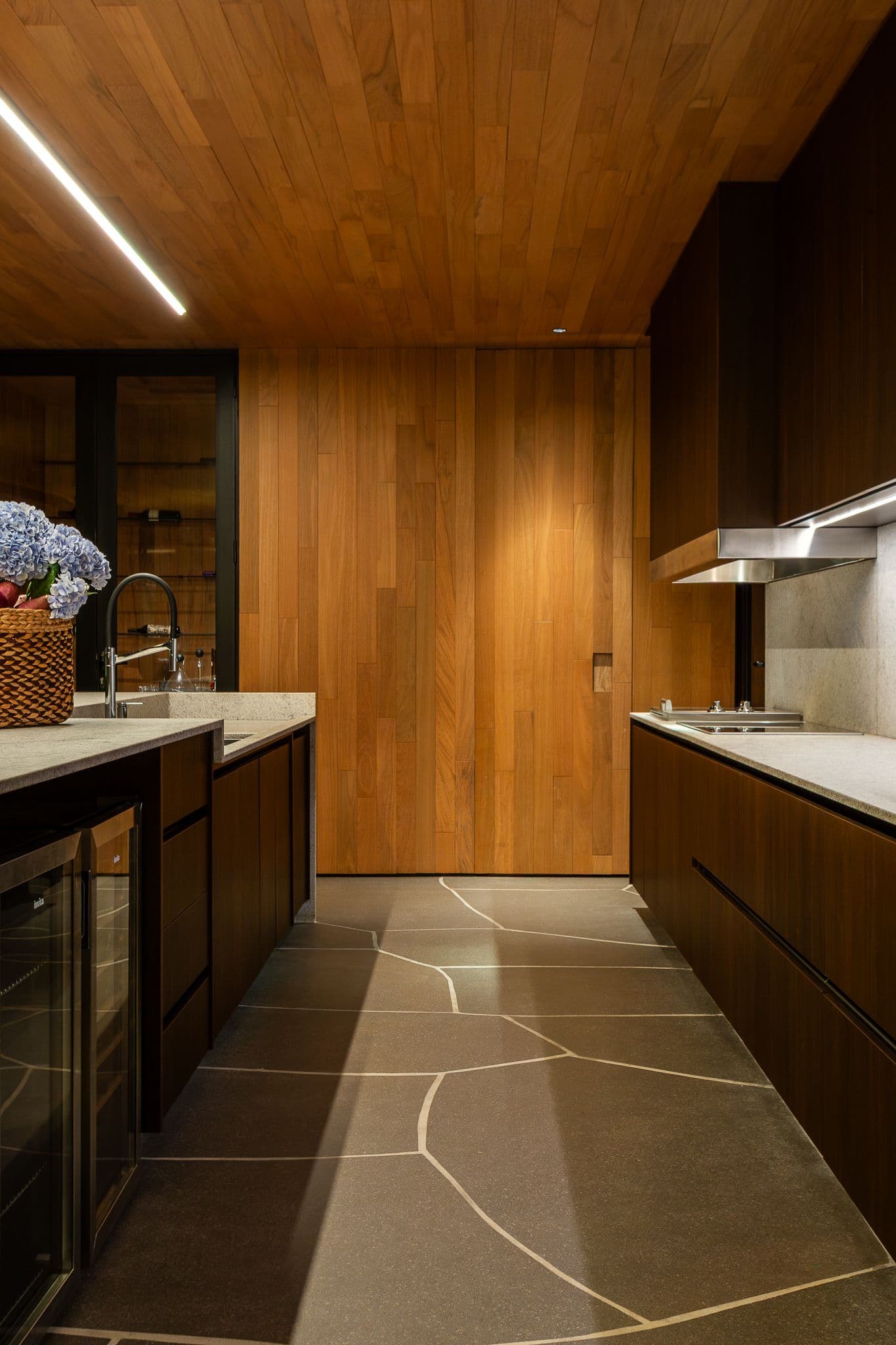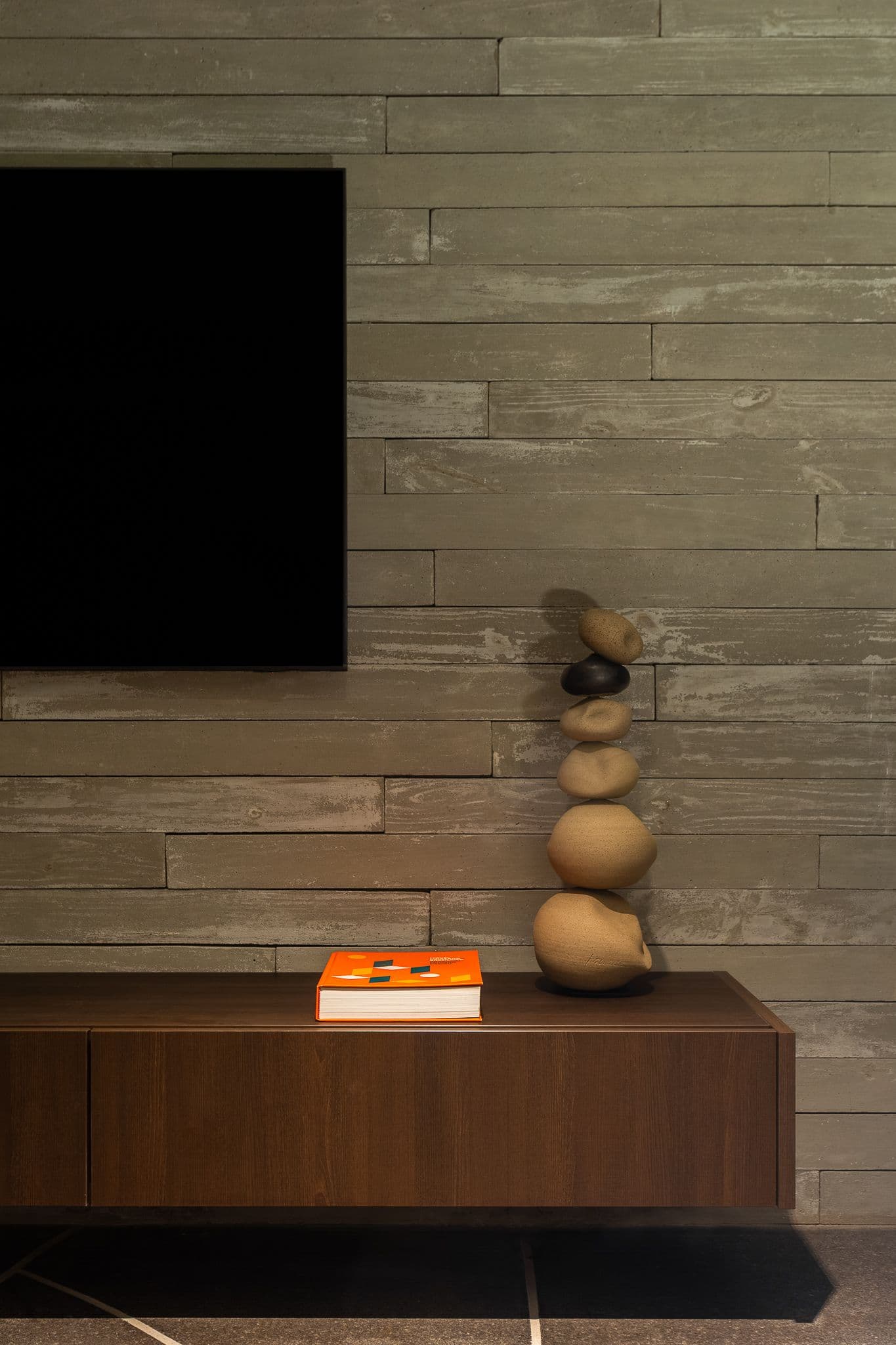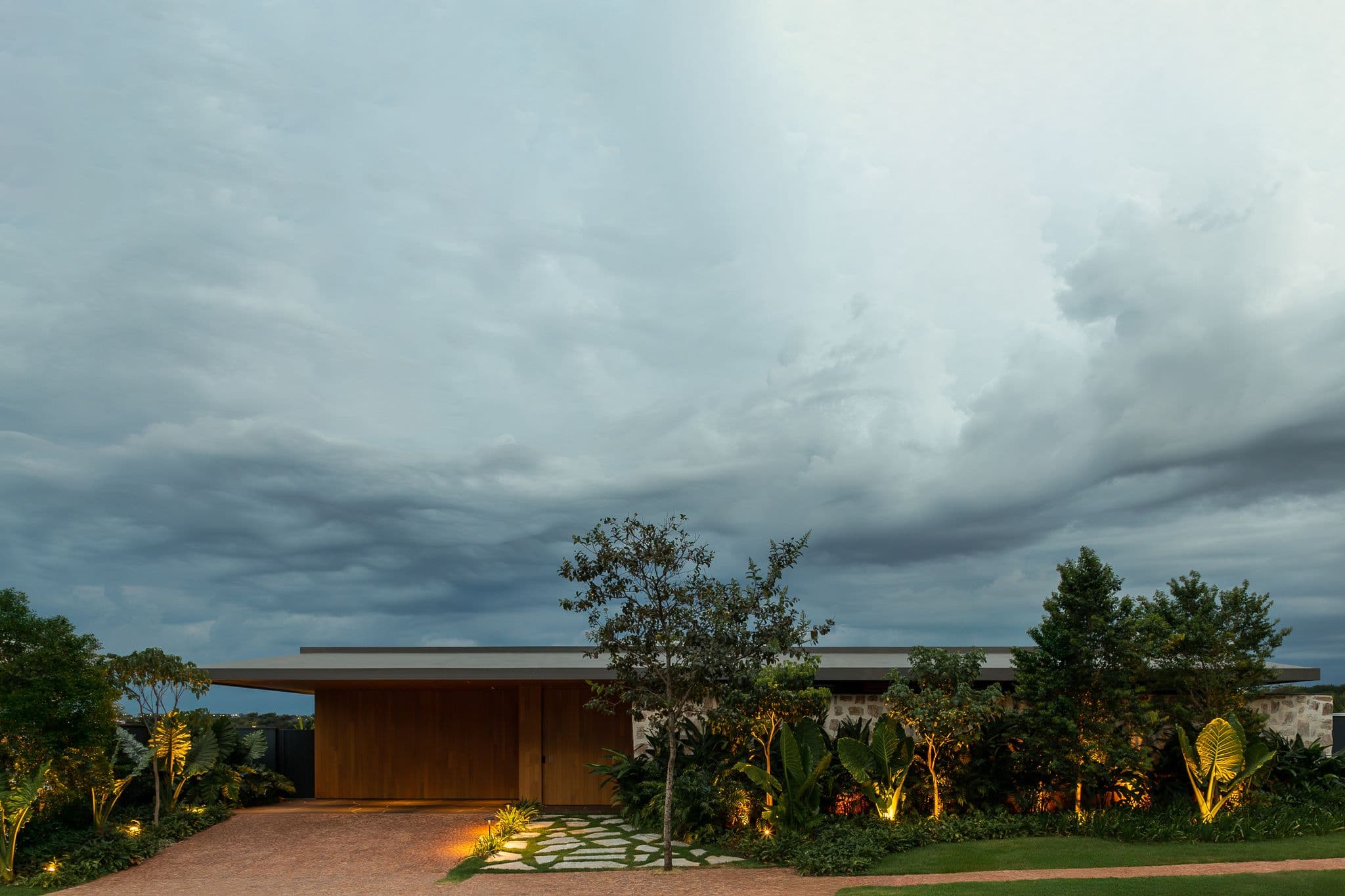 Os materiais foram escolhidos pela sua autenticidade: concreto aparente, madeira cumaru e pedra natural compõem uma paleta que envelhece com dignidade, criando texturas que mudam com a luz e as estações.