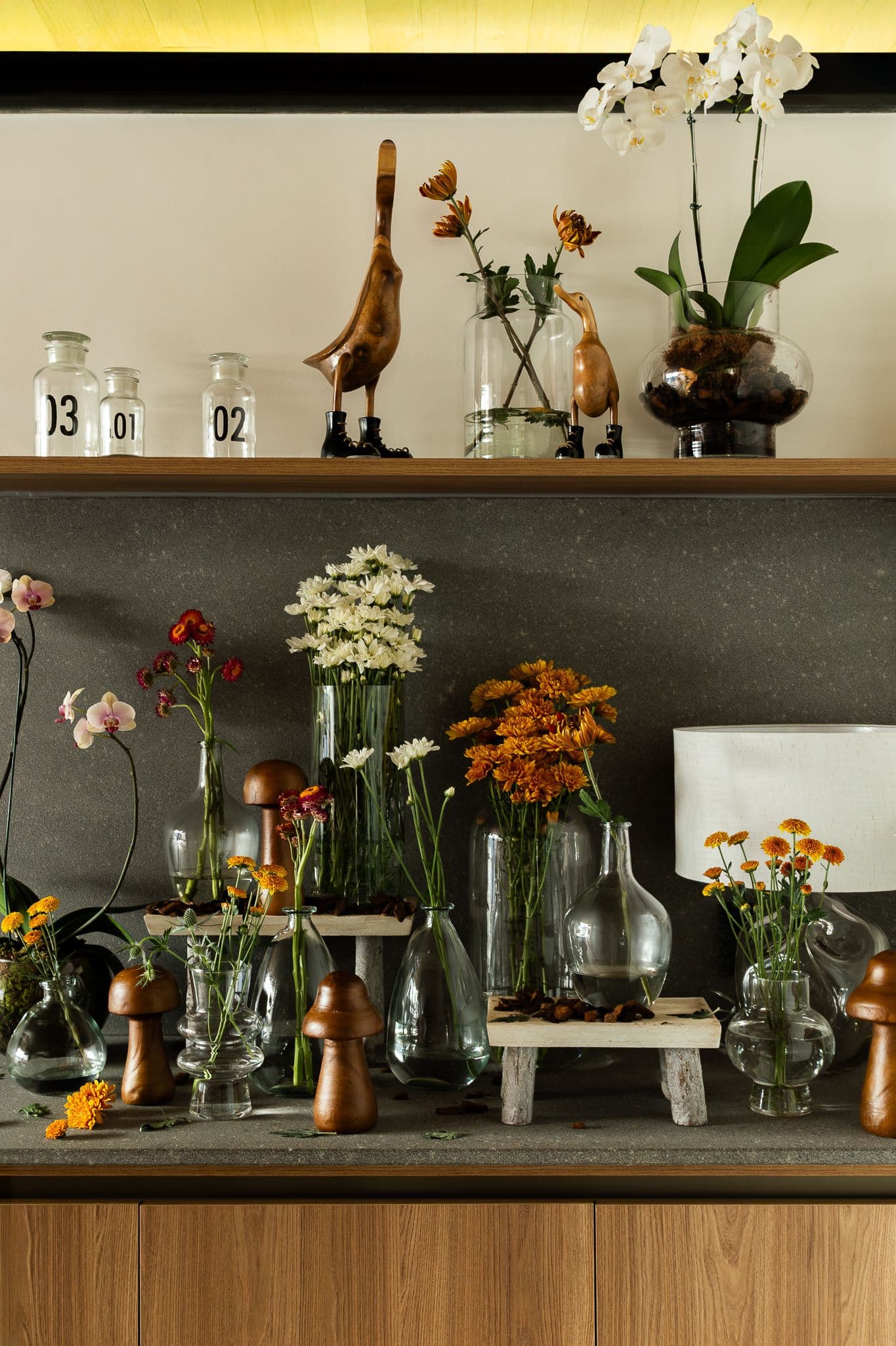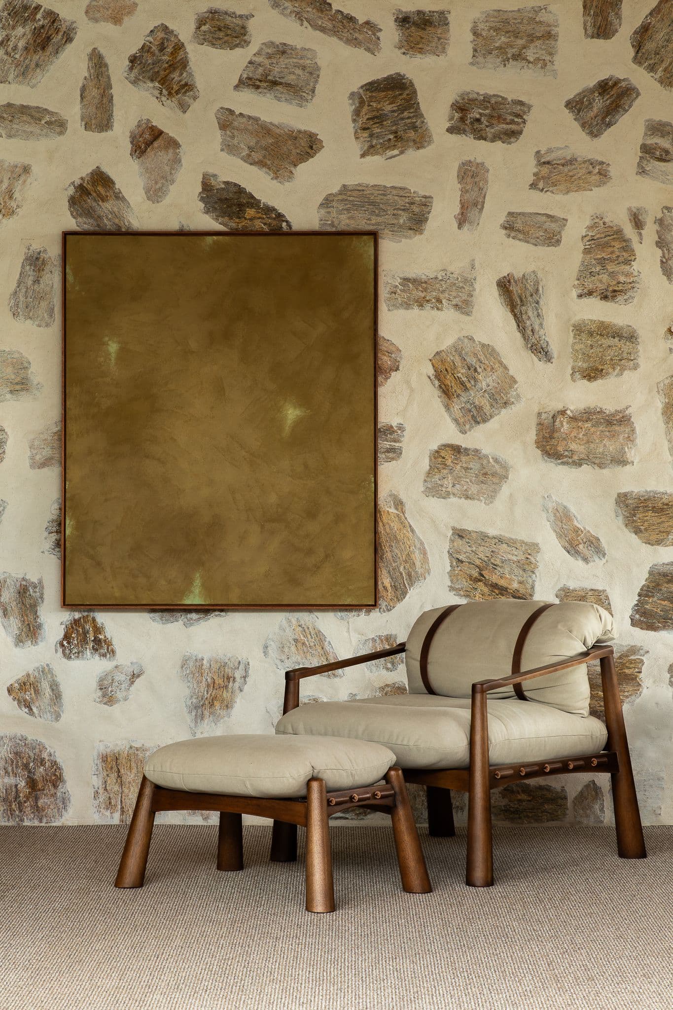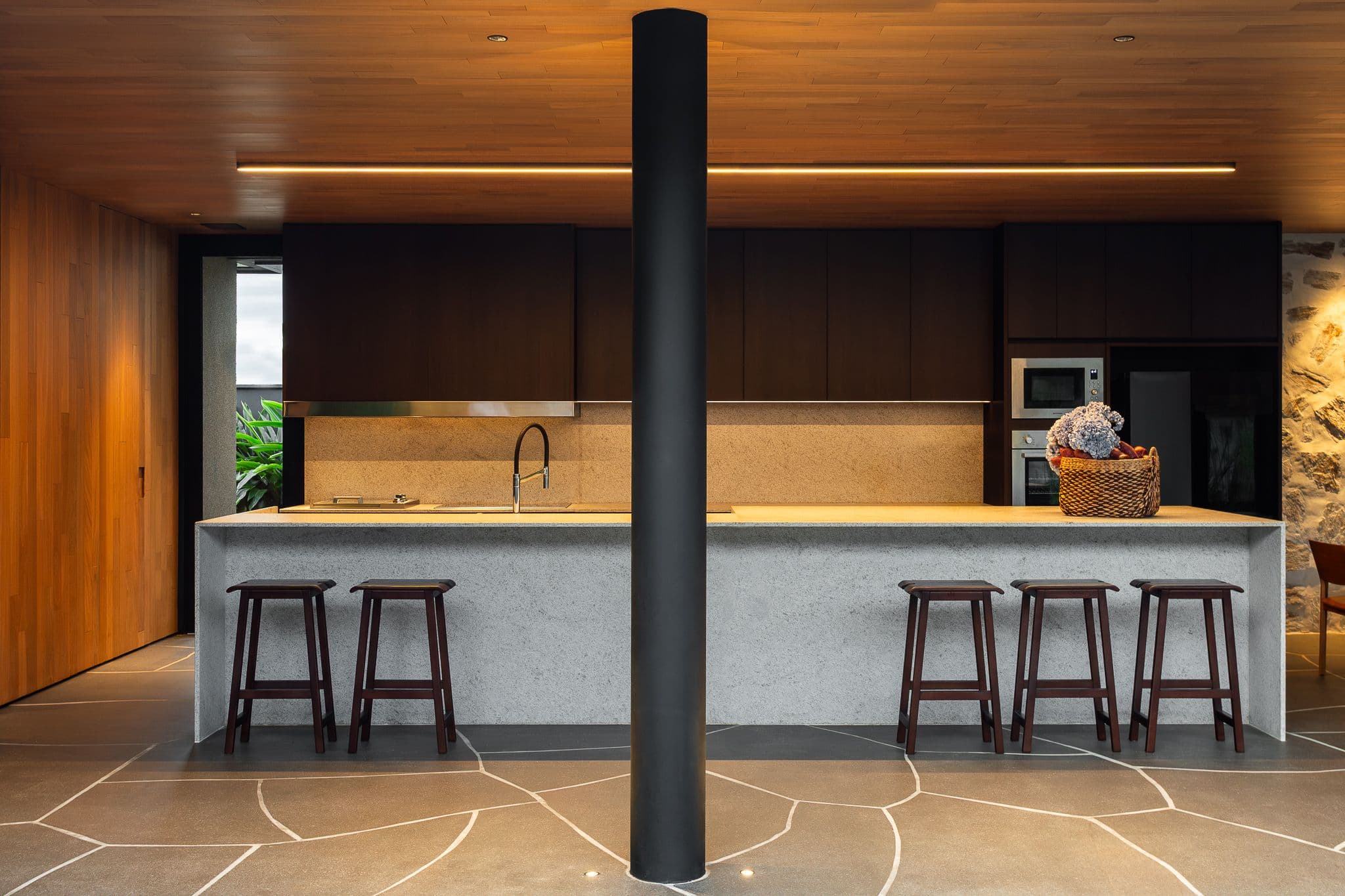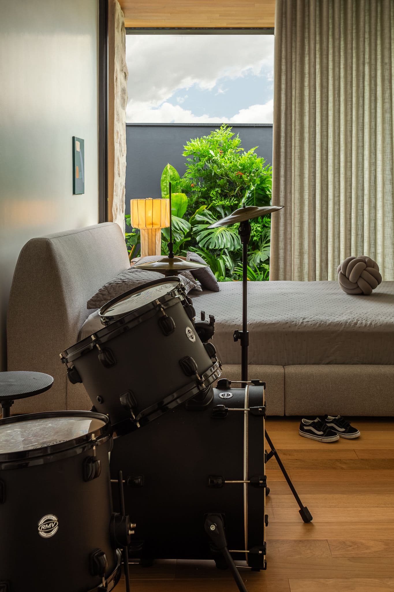Os materiais foram escolhidos pela sua autenticidade: concreto aparente, madeira cumaru e pedra natural compõem uma paleta que envelhece com dignidade, criando texturas que mudam com a luz e as estações.