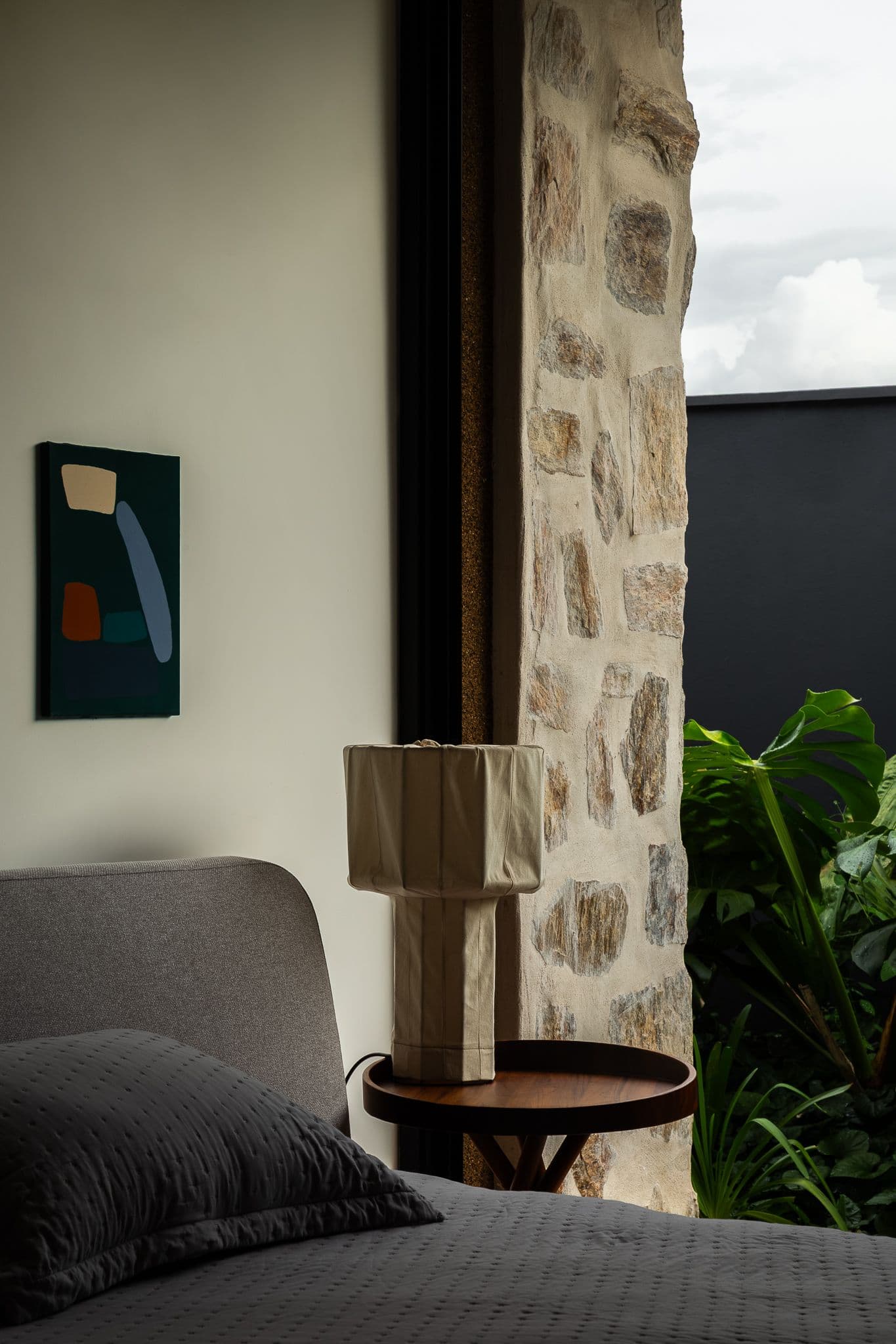 Os quartos ocupam o volume mais reservado da casa, com aberturas controladas que filtram a luz da manhã. O banheiro da suíte principal é tratado como um espaço de contemplação — com iluminação natural zenital e revestimento em pedra que se estende do piso à parede.